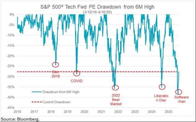 Close to 40%. Part of that is a reduction of price, while the earnings are continuing to expand. That contraction is similar to both Liberation Day (2025) and the 2022 bear market.